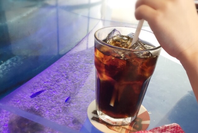 テーブルはガラスでできていて、その中にお魚が泳いでるんです(^ ^)