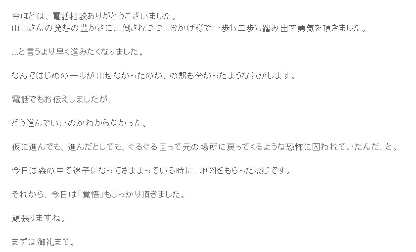 お電話相談は完全に奉仕作業なので、こうやってご自身の行動や思考に何かしらの刺激やヒントになると私自身も本当に嬉しいです^^