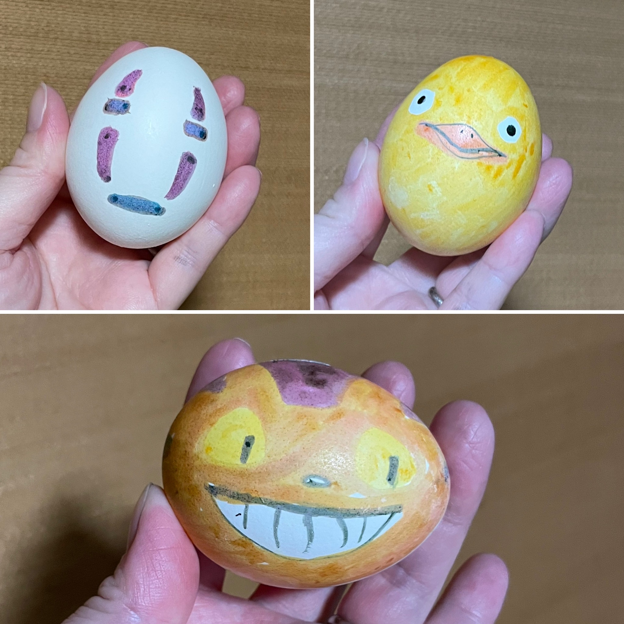 👇高2次女が描いたカオナシ、ネコバス、アヒル(千と千尋の神隠しに出てくるらしい💦)