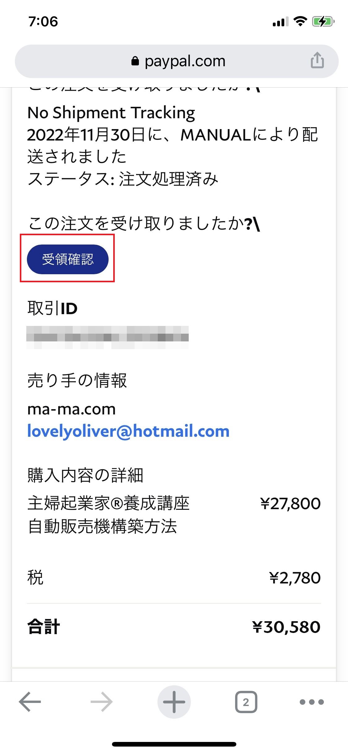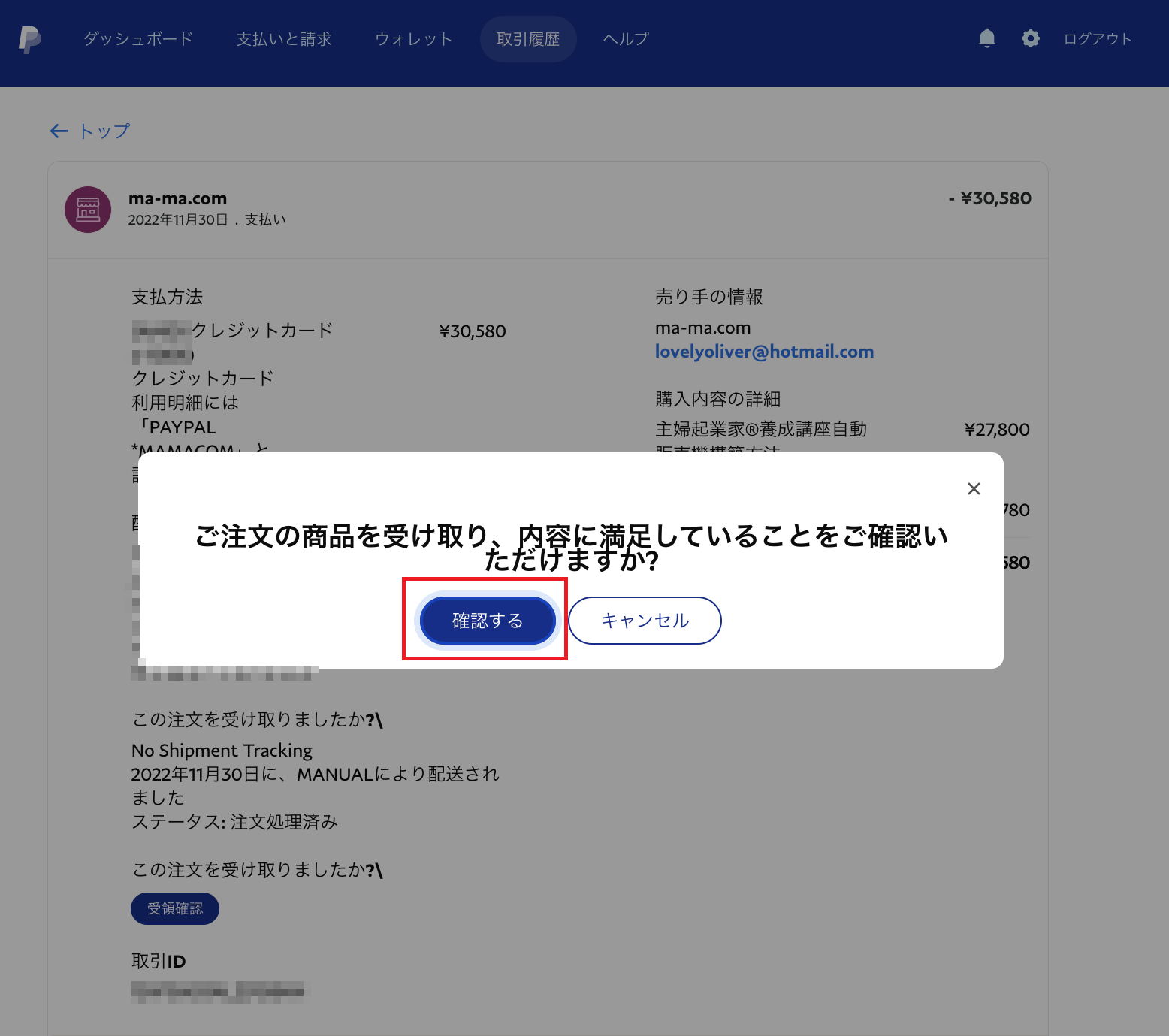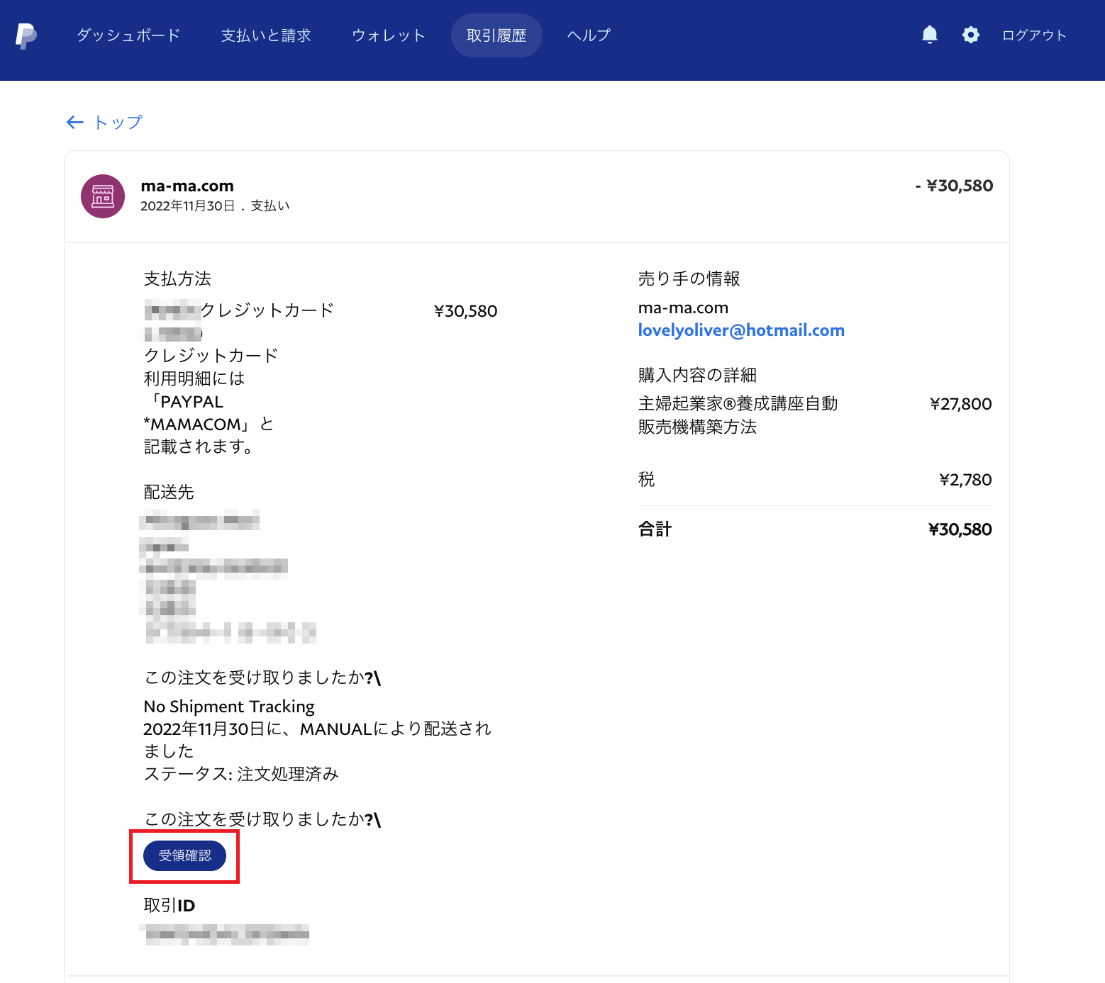 ペイパルにログイン後、開いてるページの「最近の取引」から主婦起業家®養成講座自動販売機構築方法の取引をクリック。